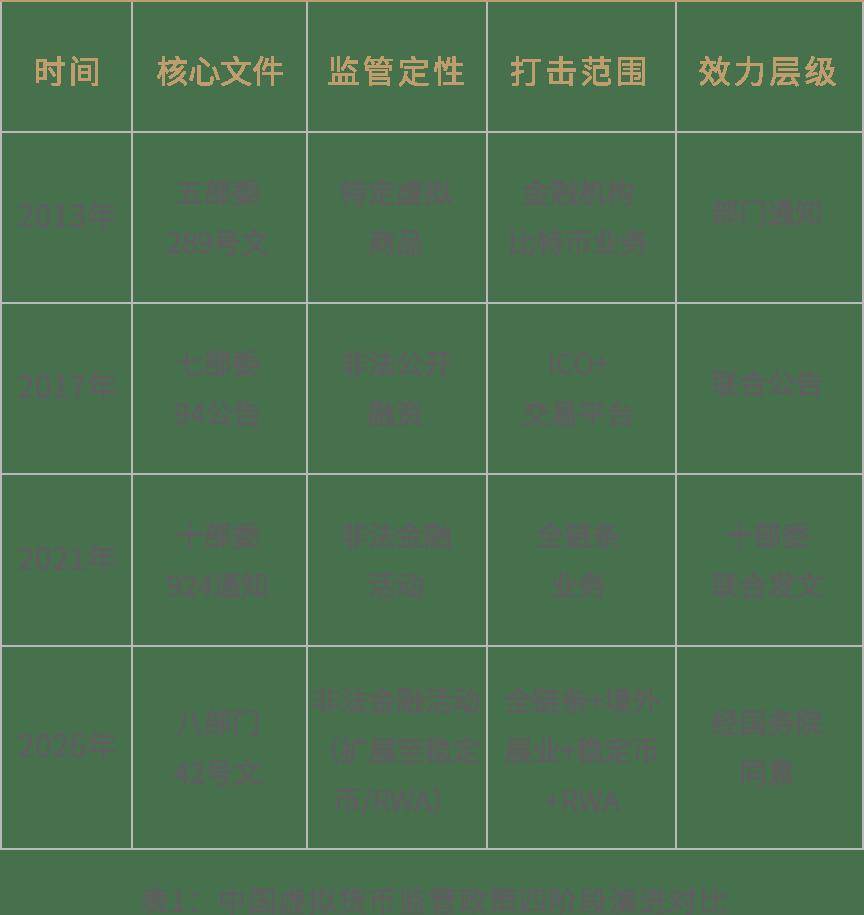 回溯中国虚拟货币监管的十三年历程,一条清晰的递进逻辑贯穿始终:打击范围持续扩大,参与部门逐步增多,法律效力层级不断提升。我们将其凝练为四个标志性阶段。