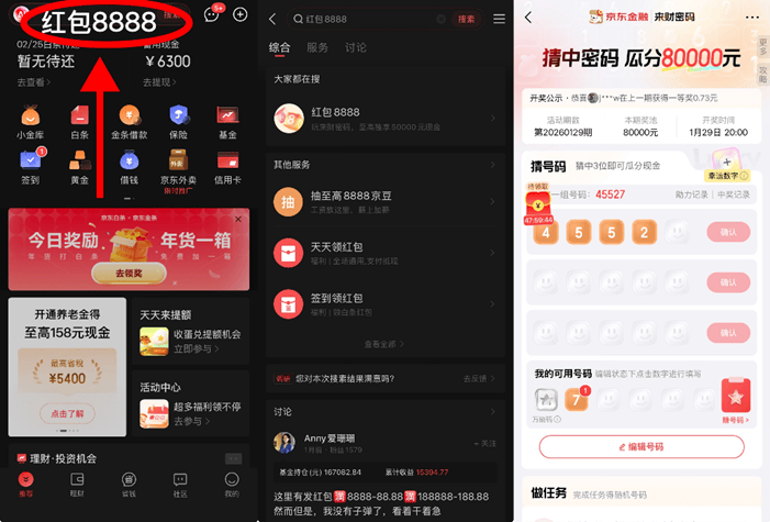 :打开京东金融 APP,在顶部搜索框直接输入【红包 8888】,点击进入就是来财密码活动页;嫌麻烦的话,打开京东 APP 搜同款关键词,也能直接参与,操作完全一致,几步就能搞定。